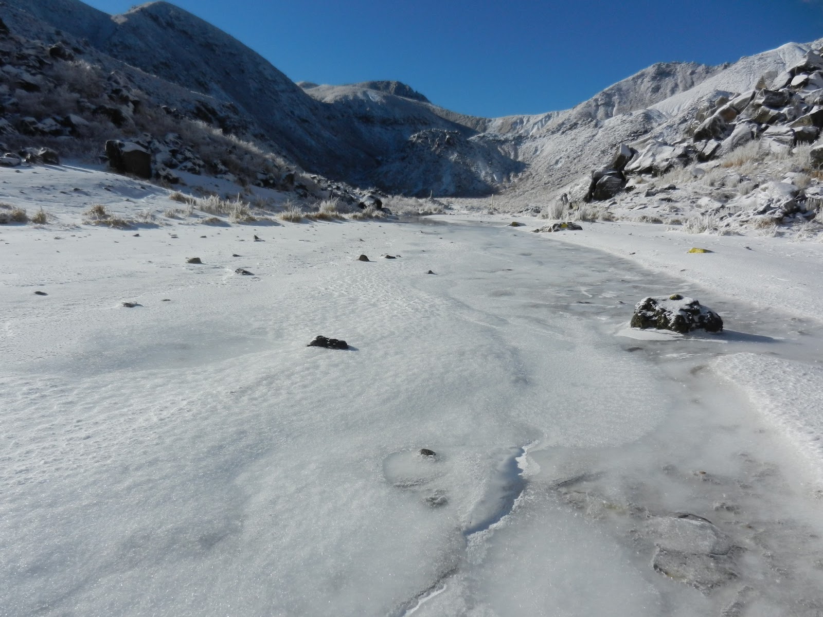 光っているのは氷です。岩は当然凍っていますが、雪の下の地面も氷です。